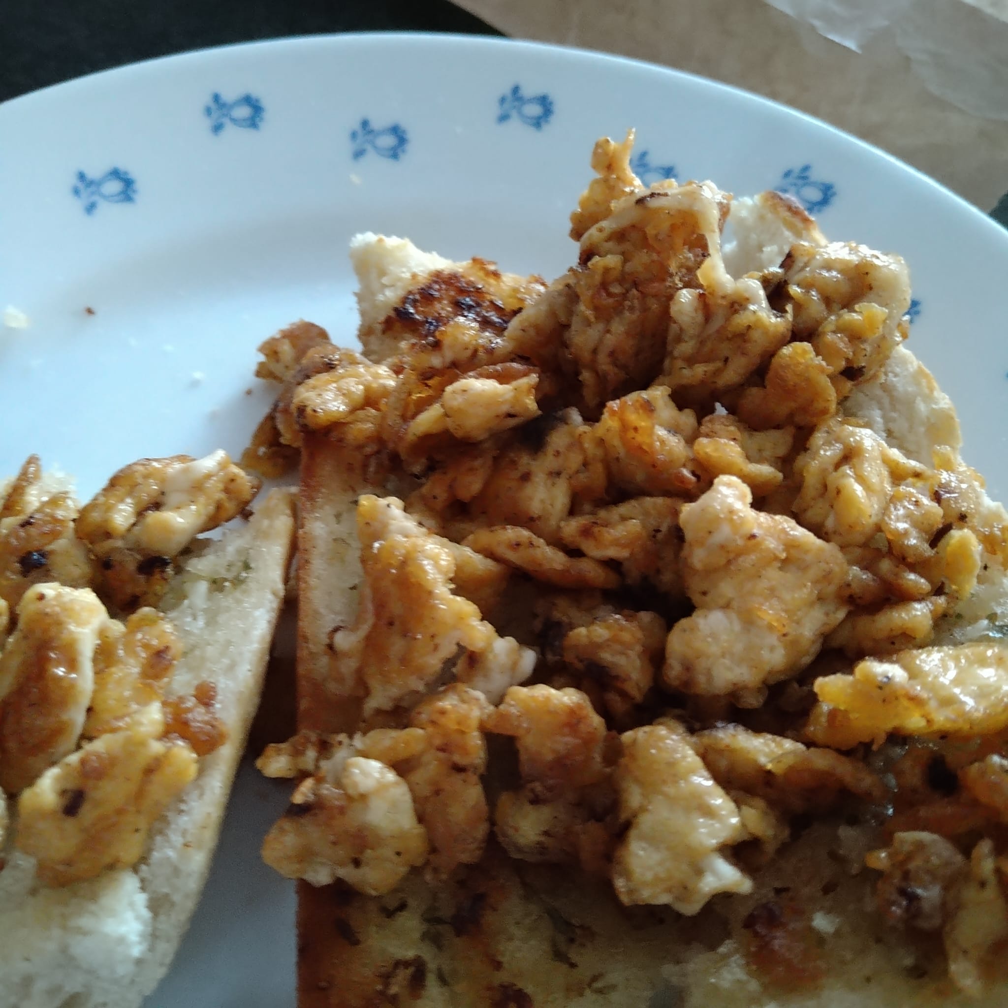 Bagety si vylepšil takhle manžel. Opečené bagety jsou potřené bylinkovým máslem a navrchu jsou smažená vajíčka se sýrem.